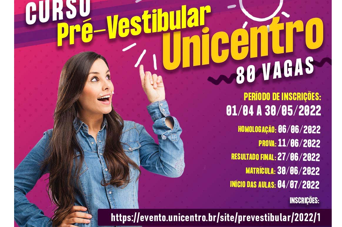 Para a turma deste ano, estão sendo ofertadas 80 vagas. A inscrição tem o valor de R$ 50,00 e pode ser feita pelo site da Unicentro até o dia 30 de maio. As aulas não têm custo e são realizadas no campus Cedeteg da Unicentro, no período noturno, entre 19h e 22h.