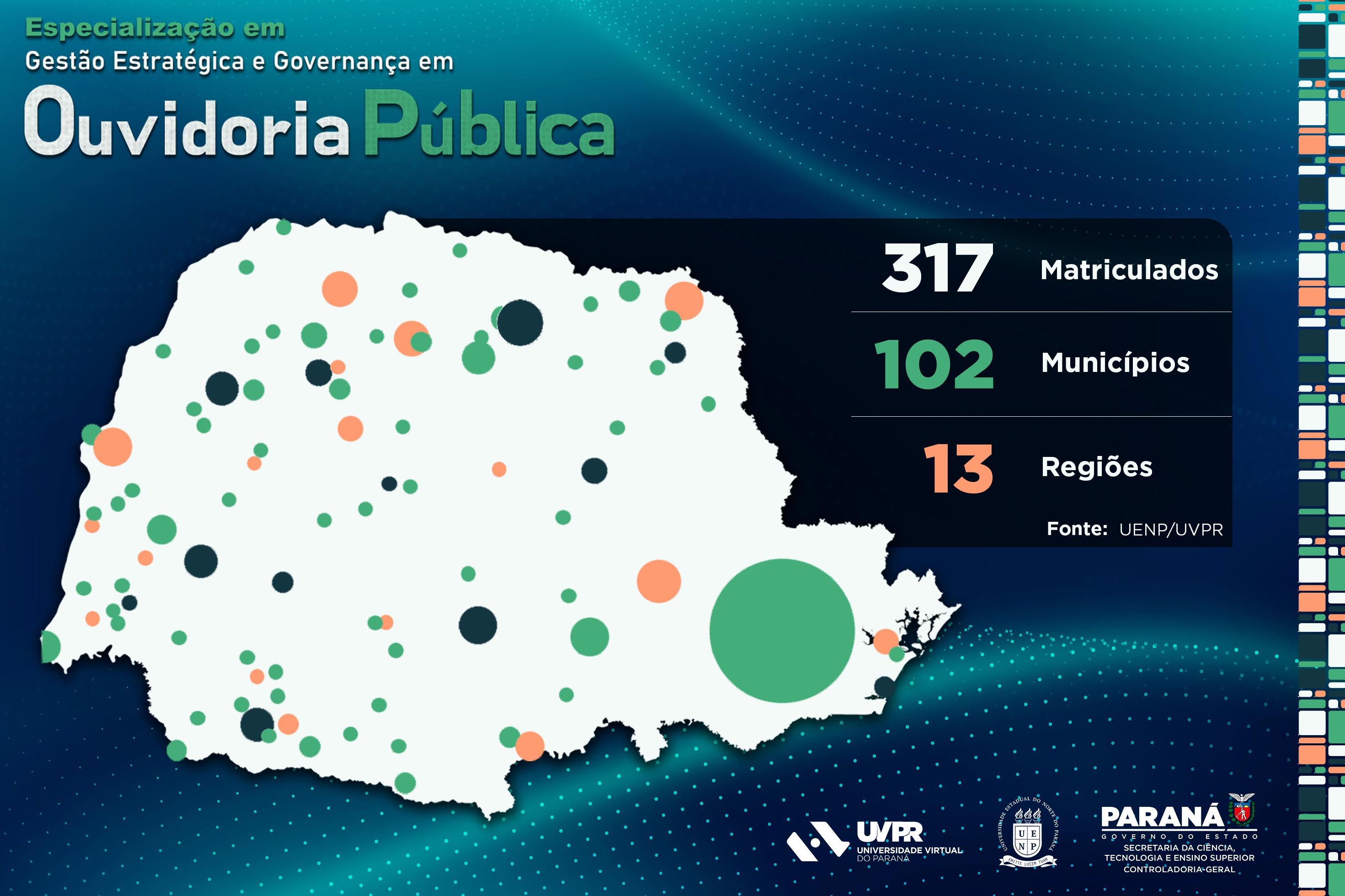 IMPACTO – O curso soma 315 alunos com formação superior em diferentes áreas do conhecimento, de 102 municípios de todas as regiões do Estado, o que reforça o alcance da ação. Mais da metade, 163, atuam em ouvidorias públicas, o que corresponde a 51,7% dos inscritos, sendo 88 ligados aos municípios. Com 116 matriculados, a Região Metropolitana de Curitiba concentra mais de um terço do total de matriculados na especialização. Na sequência, destacam-se as regiões Noroeste, Oeste e Sudoeste, que juntas reúnem cerca de 35% dos integrantes do curso (108 alunos).