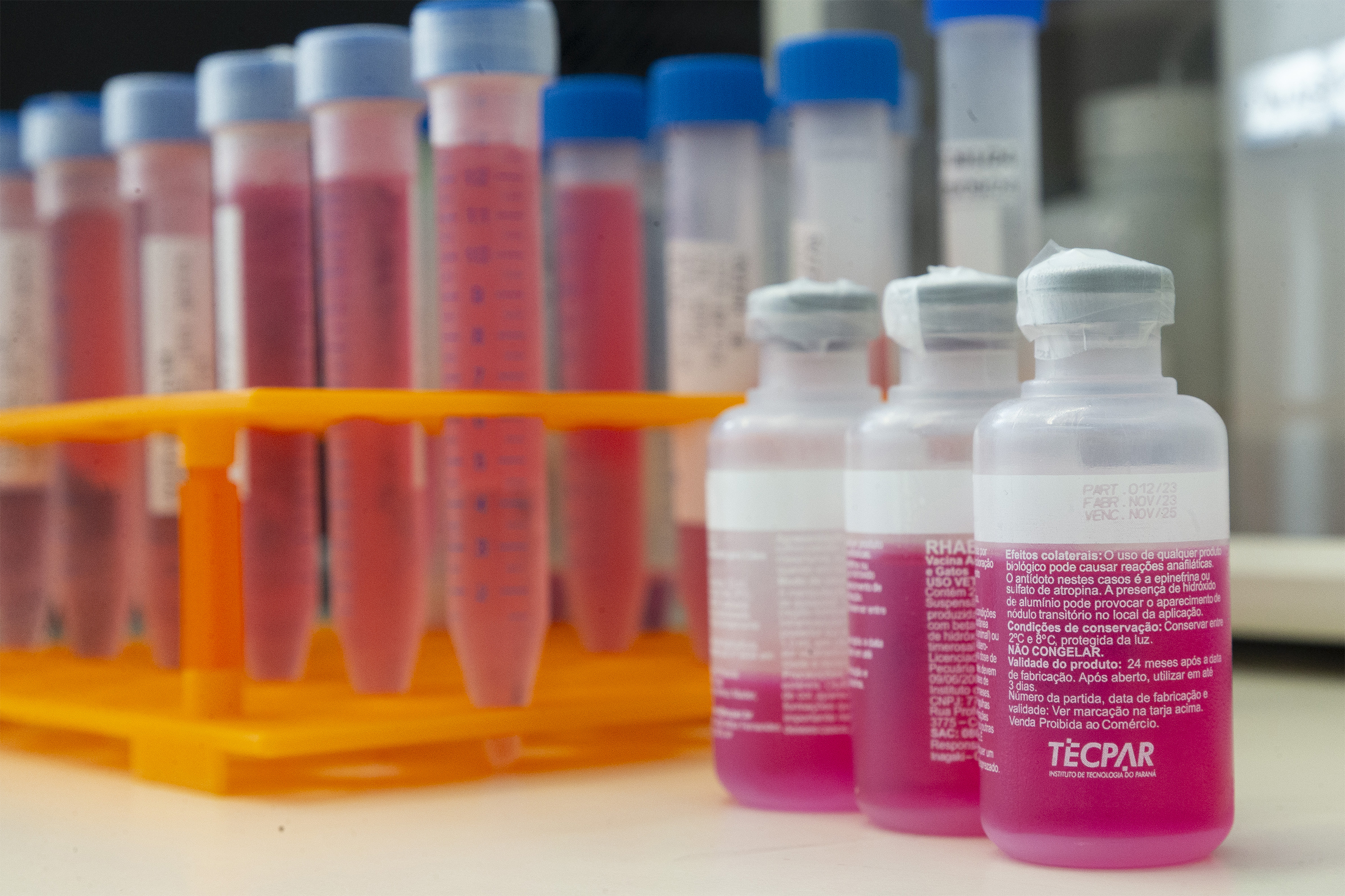 MODERNIZAÇÃO – A vacina antirrábica animal produzida pelo Tecpar é distribuída gratuitamente pelo SUS, alinhada ao conceito de Saúde Única: ao imunizar animais, reduz-se, diretamente, a incidência da doença em humanos. Para ampliar a capacidade produtiva e garantir o fornecimento nacional do imunizante, o Tecpar mantém, há quatro anos, parceria com a empresa argentina Biogénesis Bagó.